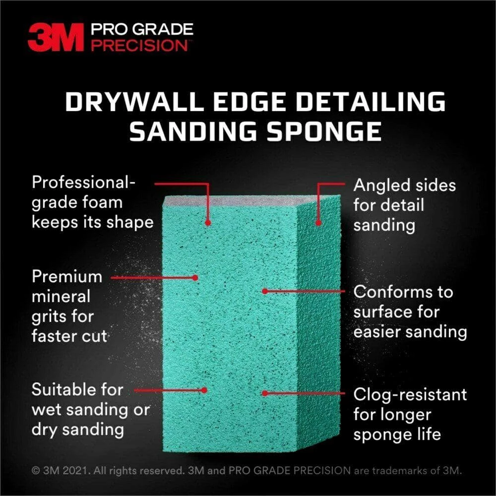 Get a smooth, professional finish with help from the 3M Pro Grade Precision Drywall Edge Detailing Angled Sanding Sponge. Designed to help make your patching and drywall jobs easy, this handing sanding sponge is made with premium minerals and ultra durable foam to get the job done fast. This sanding sponge is comfortable to grasp and allows for a firm grip for excellent control as you sand away imperfections. Use the sharply angled edge to get into tight crevices and corners, and sand larger surfaces with the flat sides. Whether you’re patching a nail hole or sanding primer, get the look you want with the 3M Pro Grade Precision Drywall Edge Detailing Angled Sanding Sponge.