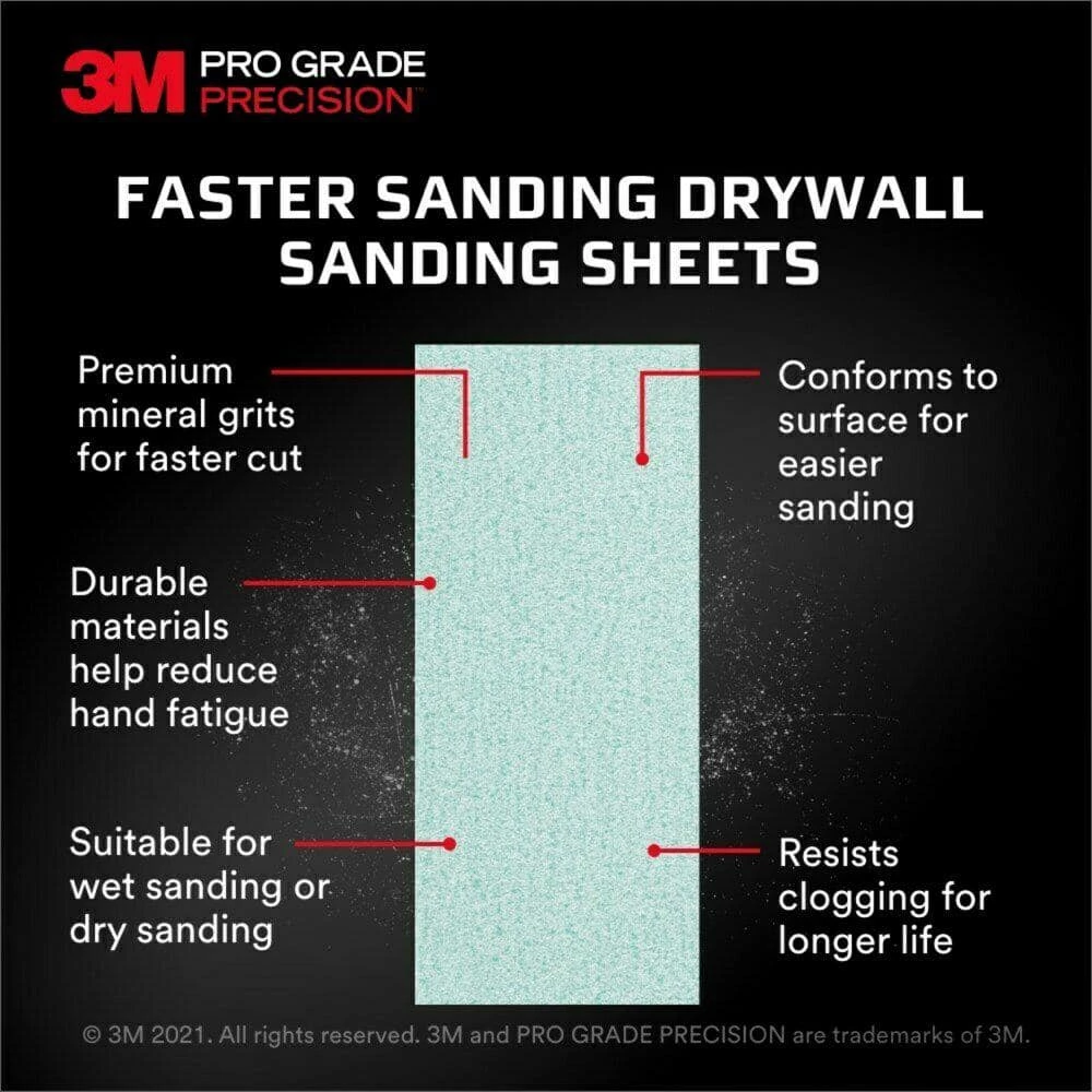 Designed for sanding drywall, spackling paste, and joint compound, 3M Pro Grade Precision Faster Sanding Drywall Sanding Sheets help you achieve a professional finish. This drywall sandpaper is pre cut so you can easily attach it to a hand sander or pole sander, and the premium minerals help you achieve your desired finish in less time. The durable, flexible premium minerals hep you achieve your desired finish. The durable, flexible backing stands up to your toughest jobs, and this versatile sandpaper is great for wet sanding and dry sanding. Whether you’re prepping new drywall for painting or smoothing drywall mud, rely on the sanding power of 3M Pro Grade Precision Faster Sanding Drywall Sandpaper.