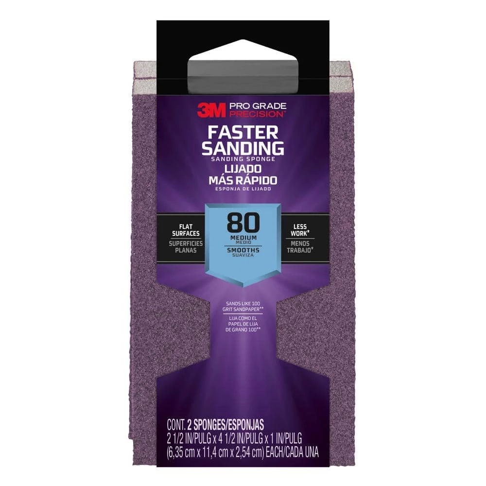 3M Pro Grade Precision Sanding Sponge is ideal for sanding painted surfaces. Also resists loading which allows for larger sanding coverage. 2 block pack, sanding sponge ideal for sanding flat surfaces. 80 grit.