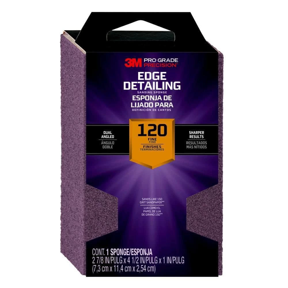 Conquer sharp corners and crevices with the 3M Pro Grade Precision Edge Detailing Dual Angle Sanding Sponge. Made from super durable foam with sharp, premium minerals, this sanding sponge helps you achieve your desired finish in a flash. Two sharp angles are perfect for getting into tight spaces, and the flat sides are great for sanding larger surface areas. The sponge material makes hand sanding comfortable, and an innovative coating resists clogging for lasting use. Whether your are re sanding your deck or refinishing a piece of furniture, rely on the 3M Pro Grade Precision Edge Detailing Dual Angle Sanding Sponge to get the job done fast and to your standards.