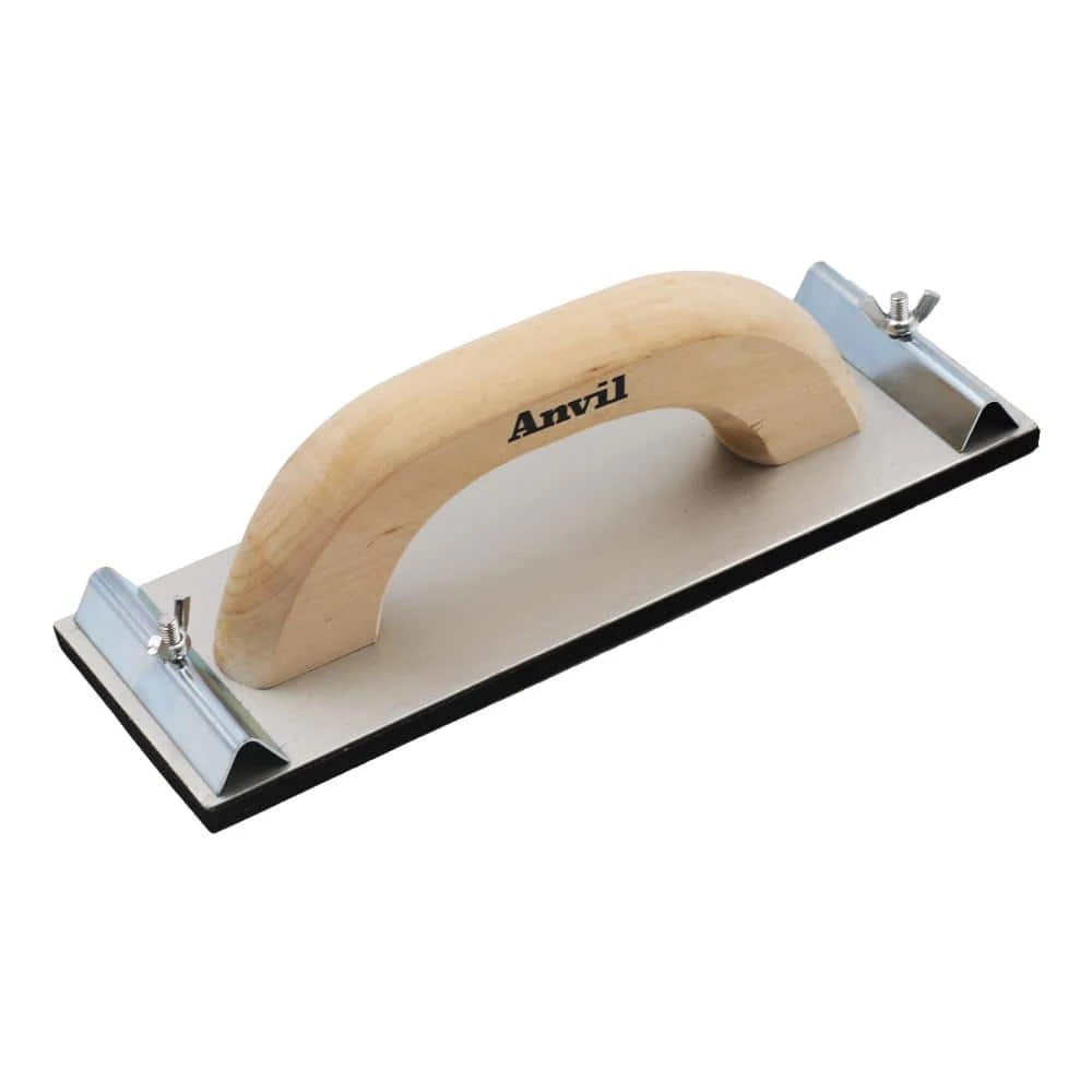 This Anvil drywall hand sander is a popular sander with a comfortable hardwood handle. Metal backing plate for high strength. Beautifully balanced, this clamp style sander is now easier to use. Thumb screws tighten clamps firmly onto sandpaper. Uses any standard die cut sandpaper. The pad dimension: 9-1/4 in. x 3-1/4 in.
