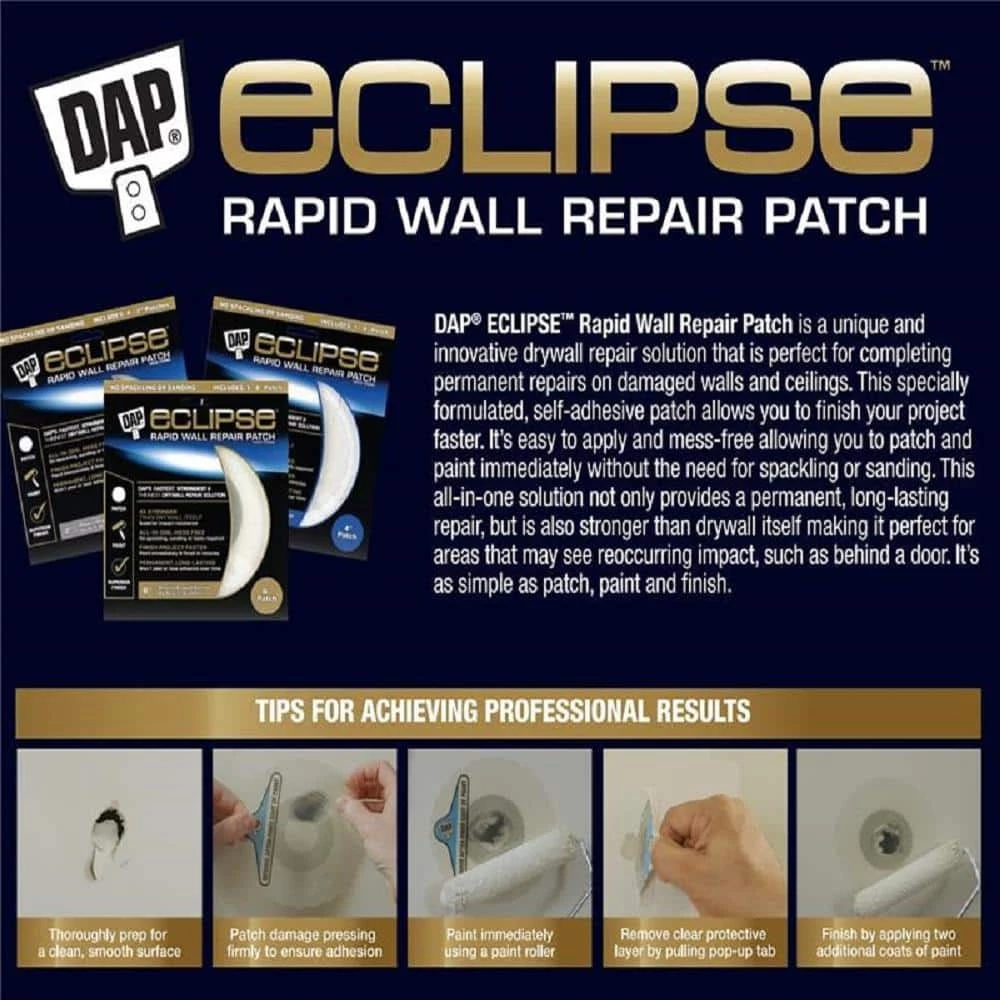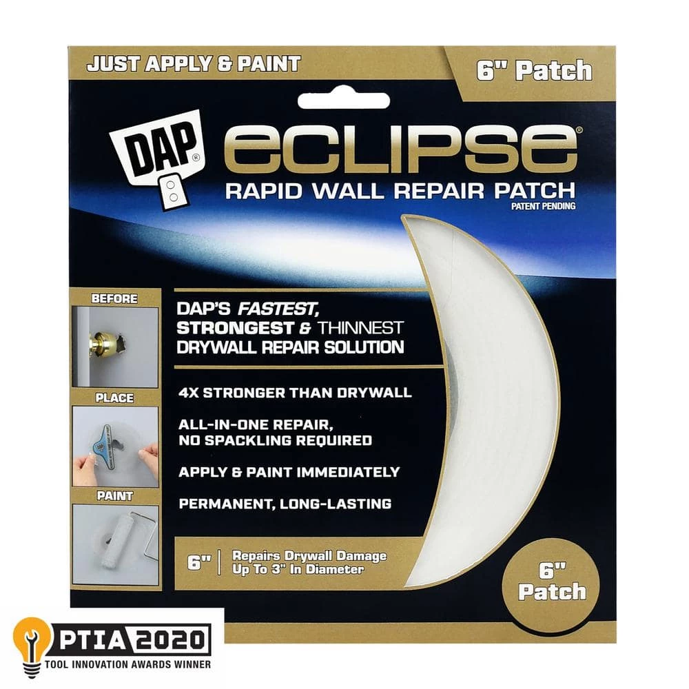 DAP Eclipse Rapid Wall Repair Patch is a new, revolutionary product solution for repairing drywall damage. No more waiting for spackling to dry or messy sanding. DAP Eclipse allows you to patch drywall damage and paint immediately, allowing you to finish your project faster. This all-in-1, mess free solution not only provides a permanent, long-lasting repair but also superior impact resistance for areas that may see reoccurring impact, such as behind a door.