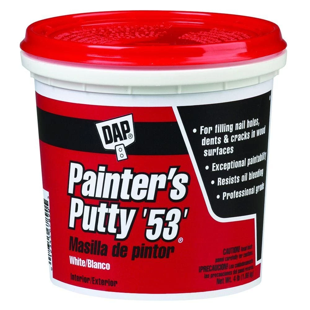 DAP Painter’s Putty ’53’ is a smooth, easy working putty designed for the special needs of professional painters. It is ideal for filling small holes and cracks in interior and exterior surfaces such as baseboards, windowsills and woodwork. It has exceptional adhesion and resists oil bleeding. It may also be used to glaze wooden window sashes.