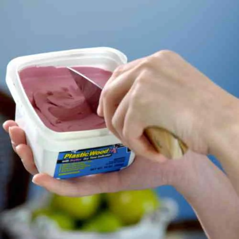 DAP Plastic Wood-X All Purpose Wood Filler with DryDex Dry Time Indicator goes on pink and dries natural indicating when it’s time to sand and stain. This patented technology eliminates the guesswork and reduces the chance of errors. It’s ready-to-use formula spreads easily for fast, professional repairs.