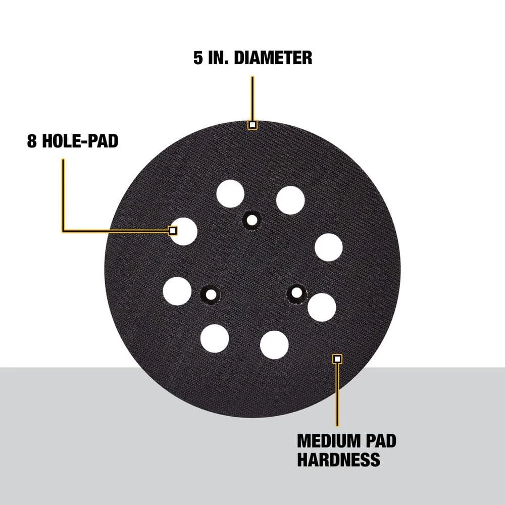 The DEWALT 5 in. Random Orbit Palm Sander Pad is made for use with the D26450, D26451, D26451K, D26453K and D26456 sanders. For added convenience, this sander pad allows for switching between grits. 8 Hole design for effective use with dust collection.