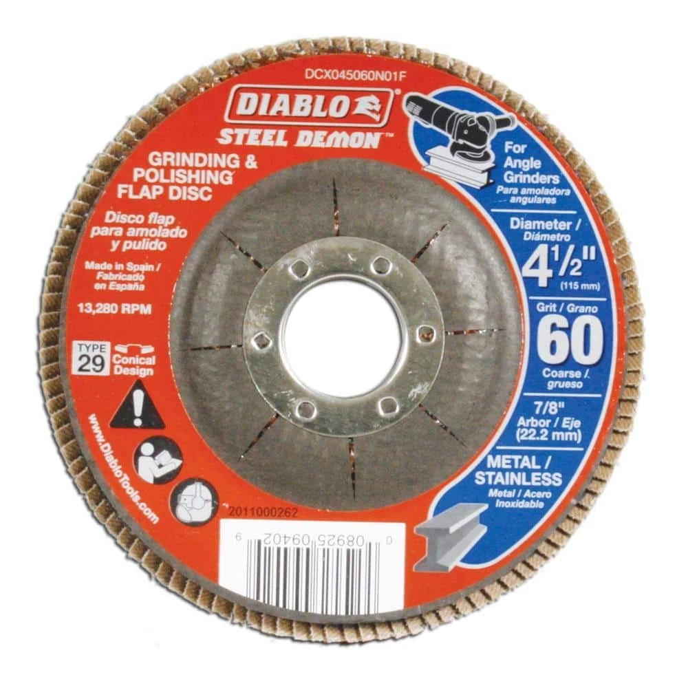 Designed for use with an angle grinder, this Diablo 4-1/2 in. Steel Grinding and Polishing Flap Disc grinds and polishes simultaneously to help you scale down and smooth out metal and stainless steel surfaces. A conical shape and 60-grit (course) composition combine for efficient material removal, leaving behind a shiny surface that gives your work piece a revitalized appearance and/or operational resurgence.