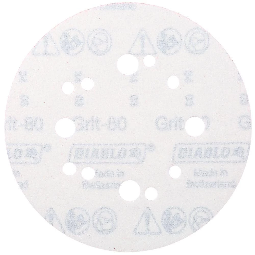 Diablo’s premium 5 in. 80-Grit universal, 12-hole Random Orbital Sanding (ROS) discs with Hook and Lock backing includes break-through innovations that improve performance, extend sanding life and increase productivity. Featuring a premium ceramic blend, these discs remove material faster than other sanding discs and offer an extra long sanding life. Clog-SHIELD, Diablo’s own blend of grinding agents, reduces loading thus maximizing productivity. The superior Grit-to-backing bond, ENDURA-BOND, provides Diablo’s sanding discs with longer life and extreme durability.