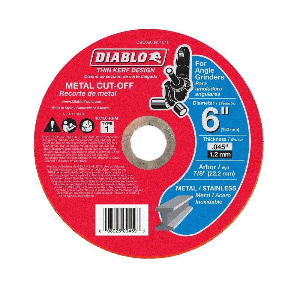 Diablo premium 6 in. x 0.045 in. x 7/8 in. Metal Cut-Off Disc with Thin Kerf design provides premium performance and increases productivity. Diablo Thin Kerf design provides for a thin cut, allowing your power tool to work at its full potential. This disc is designed for use in angle grinders and is ideal for all types of metal/stainless steel materials.