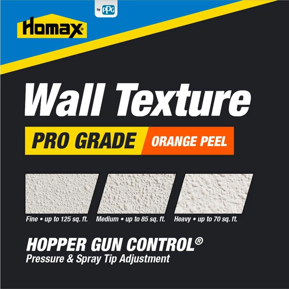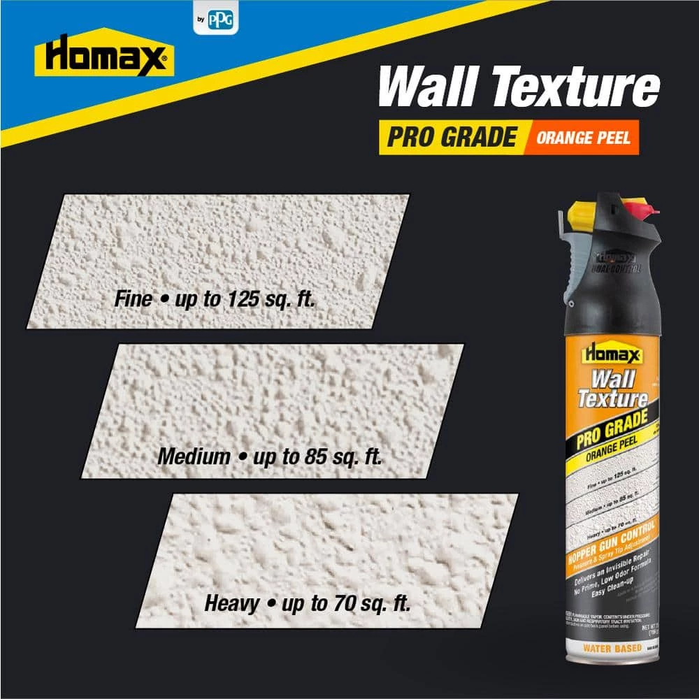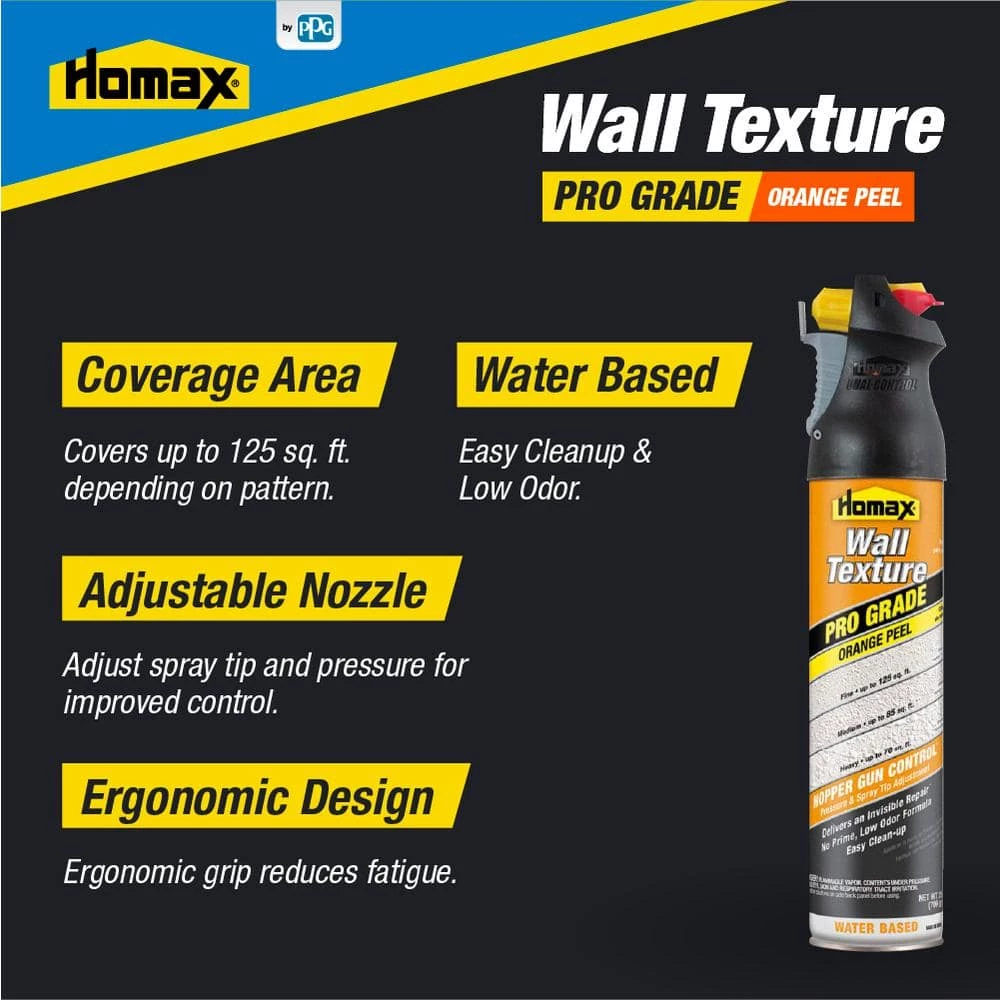 Homax Pro Grade Wall Texture with Hopper Gun Control technology is the latest innovation in aerosol textures. This professional tool features adjustment of both pattern and pressure – similar to that of a gun and hopper. The patented adjustable nozzle allows you to match your existing wall texture. The advanced water-based Pro Formula will save the pro time with a no-prime, easy cleanup technology. This time-saving tool provides portable and convenient delivery of a full range of texture patterns to achieve an invisible repair on interior wall surfaces.