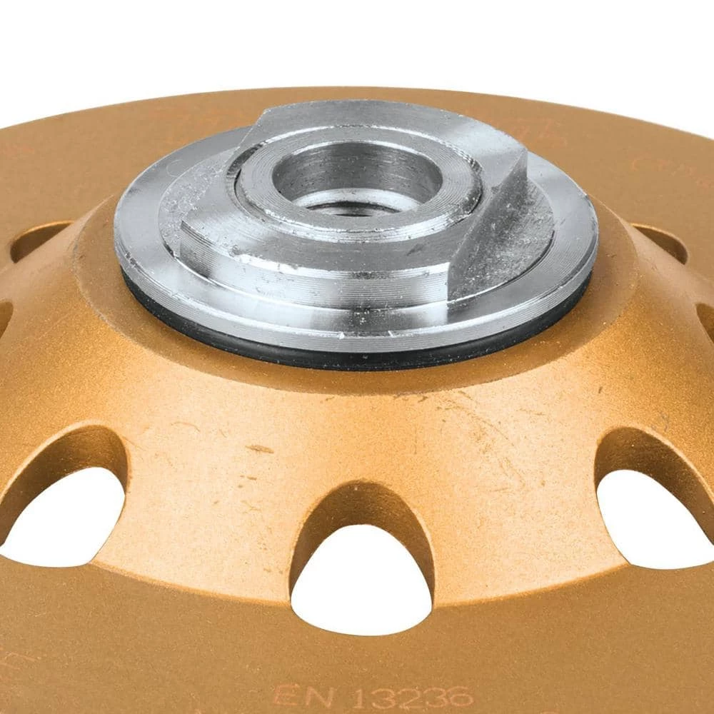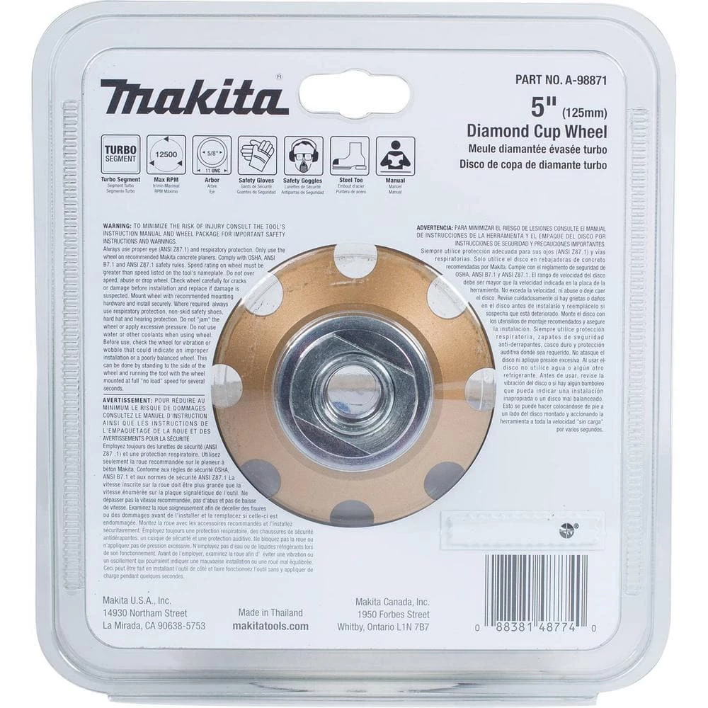 The Makita 5 in. Low-Vibration Diamond Cup Wheel (A-98871) is engineered for improved performance and less vibration. It is an ideal accessory for use with 5 in. angle grinders with an electronic controller and is built for paint and adhesive removal as well as concrete surface preparation. The innovative design produces fast material removal and a smooth finish. The innovative design is engineered to reduce “chatter” for improved operator comfort.