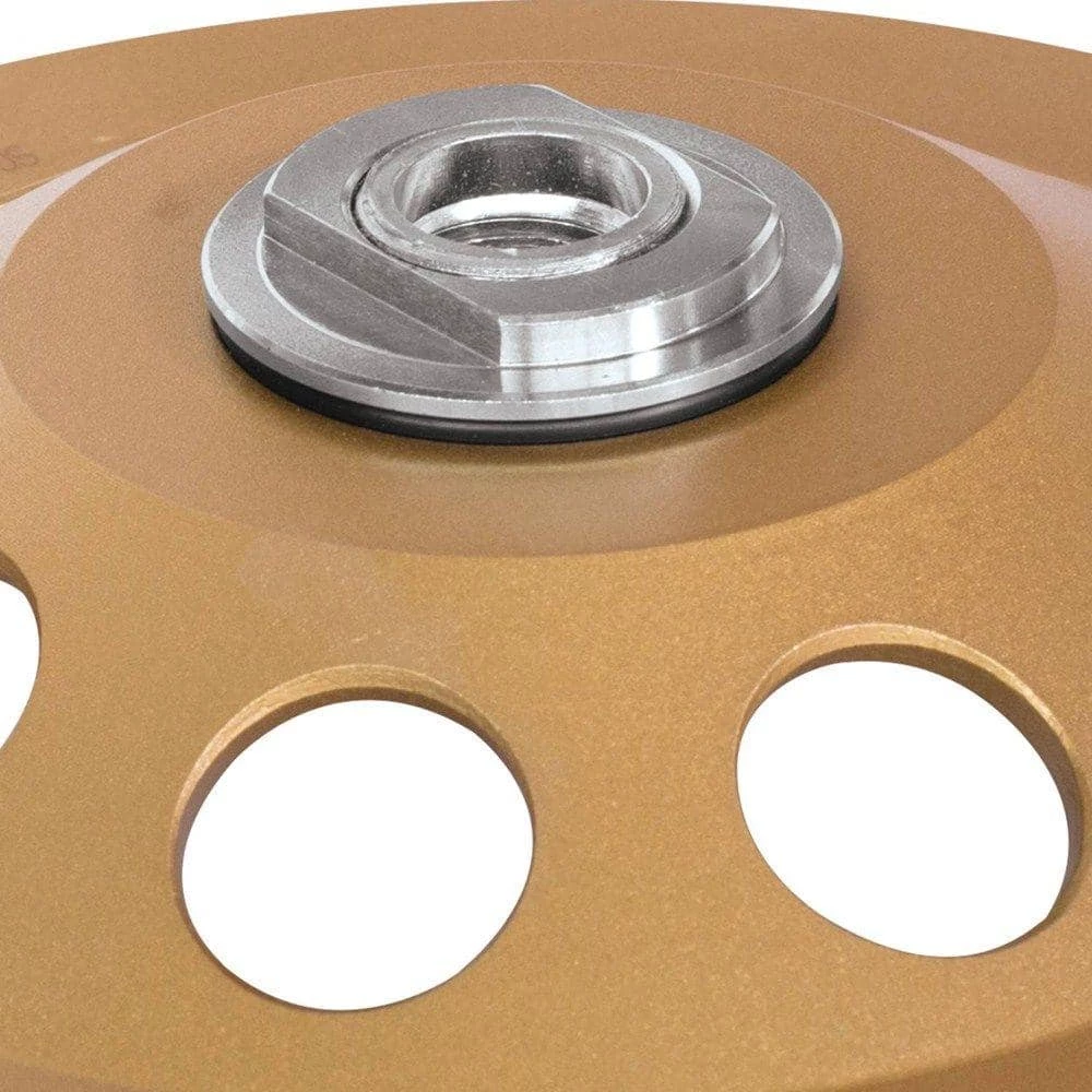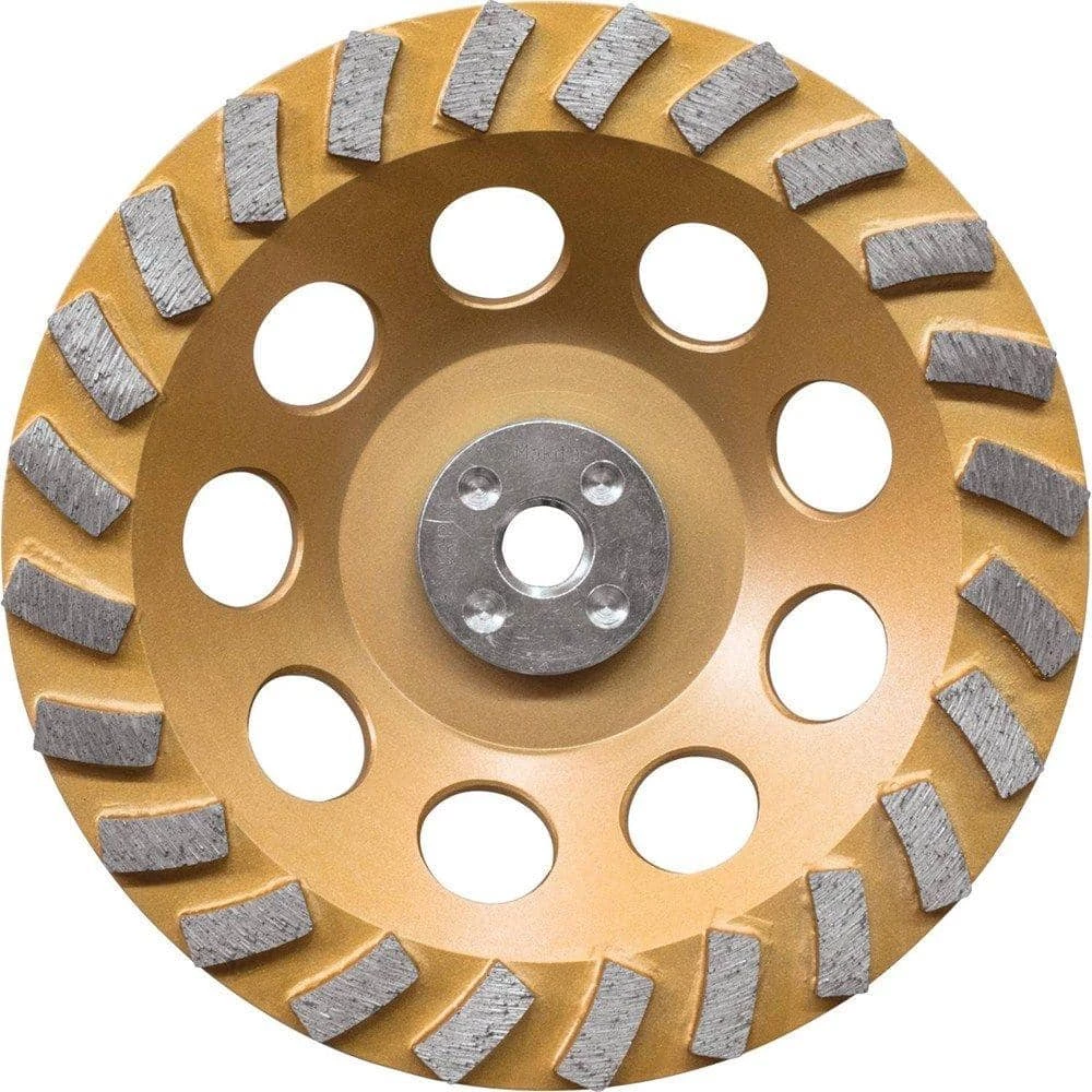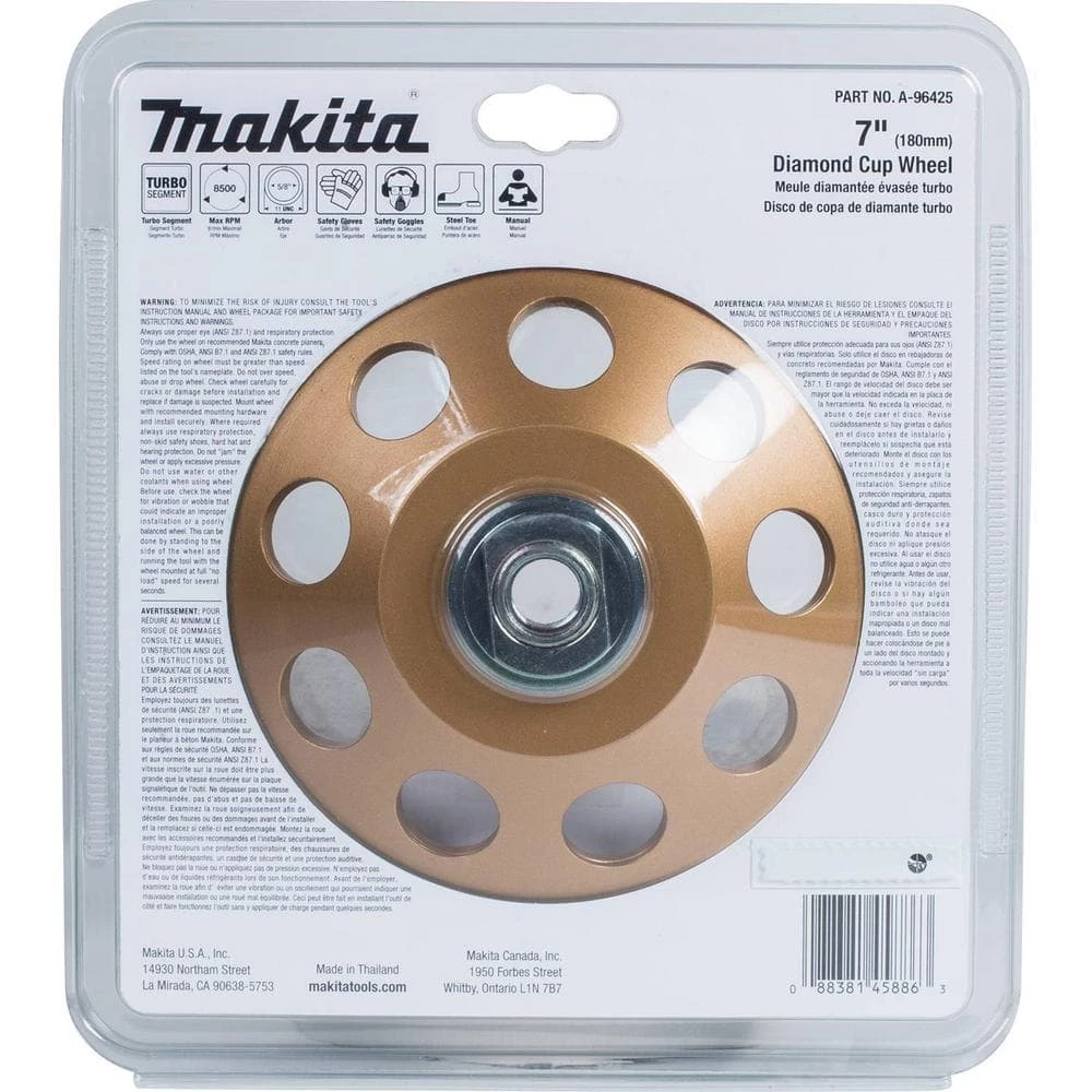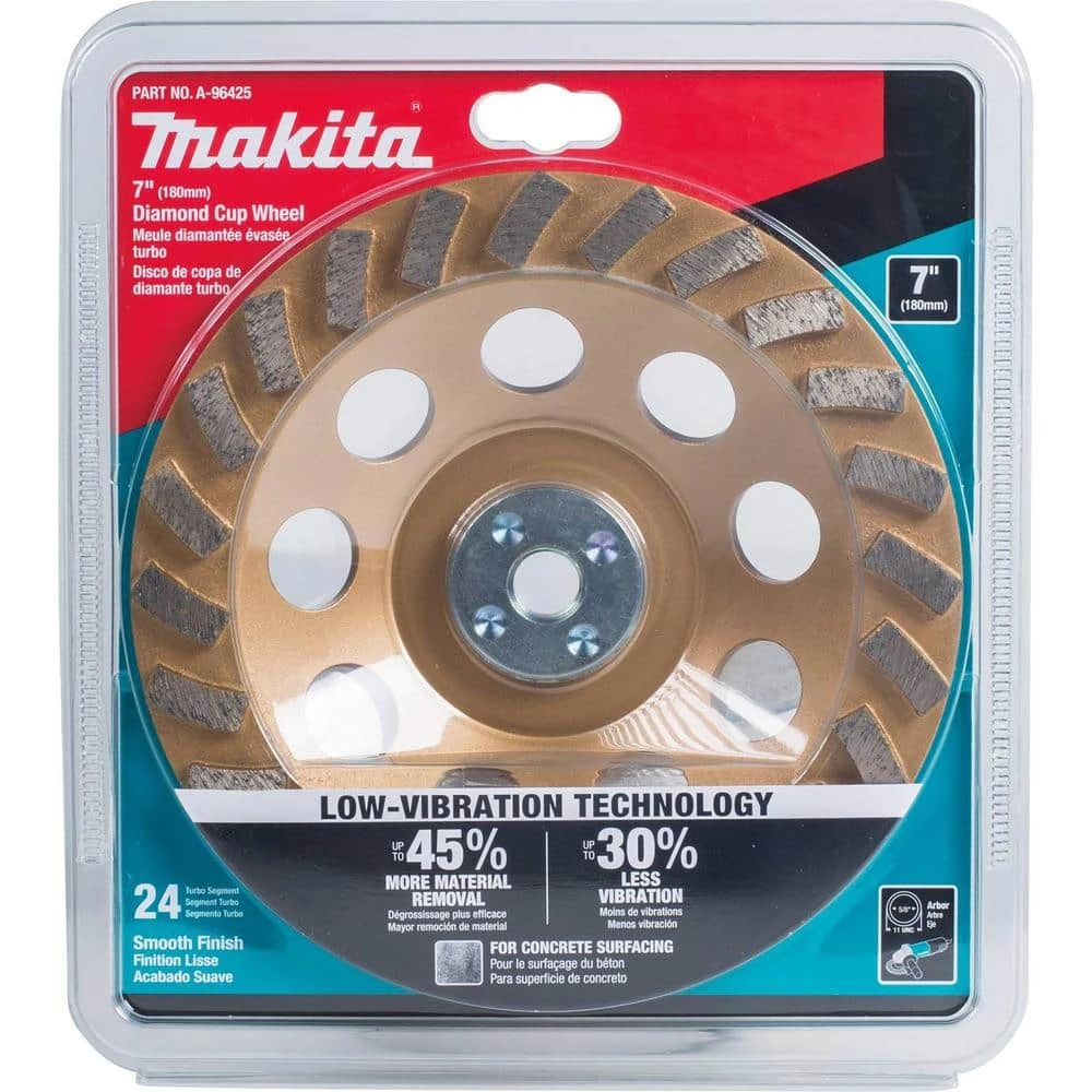 The Makita 7 in. Anti-Vibration Diamond Cup Wheel (A-96425) features a 24-segment turbo rim design and is engineered for improved performance and less vibration. It is an ideal accessory for use with 7 in. angle grinders with an electronic controller and is built for paint and adhesive removal as well as concrete surface preparation. The innovative design produces fast material removal and a smooth finish. The innovative design is engineered to reduce chatter for improved operator comfort.
