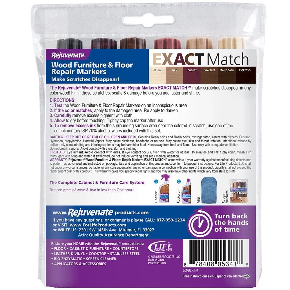 Restore the look of your interior wood floors, furniture and cabinets. The Rejuvenate Wood Furniture and Floor Repair Markers fill in damage marks. They match natural wood tones in maple, oak, cherry, walnut, mahogany and espresso.