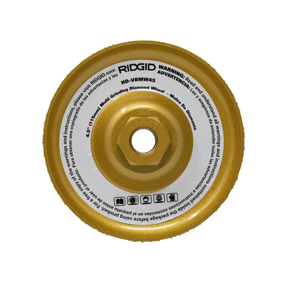 RIDGID V-Tech Multipurpose Grinding Wheels are engineered with top-grade industrial diamond for maximum grinding performance and superior grinding life. Vacuum Brazing technology provides 100X more life than standard abrasives. Unlike traditional abrasive grinding wheels the RIDGID Multi Purpose Wheels have a solid steel core which makes it safer to use and reduces sparks, dust and debris. These grinding wheels can be used for a wide range of materials such as Metal, Cast Iron, Copper, Masonry and Stone. 4.5 in. grinding wheel will fit a variety of small angle grinders with a 7/8 in. or 5/8 in.-11 threaded arbor. Dry use only.