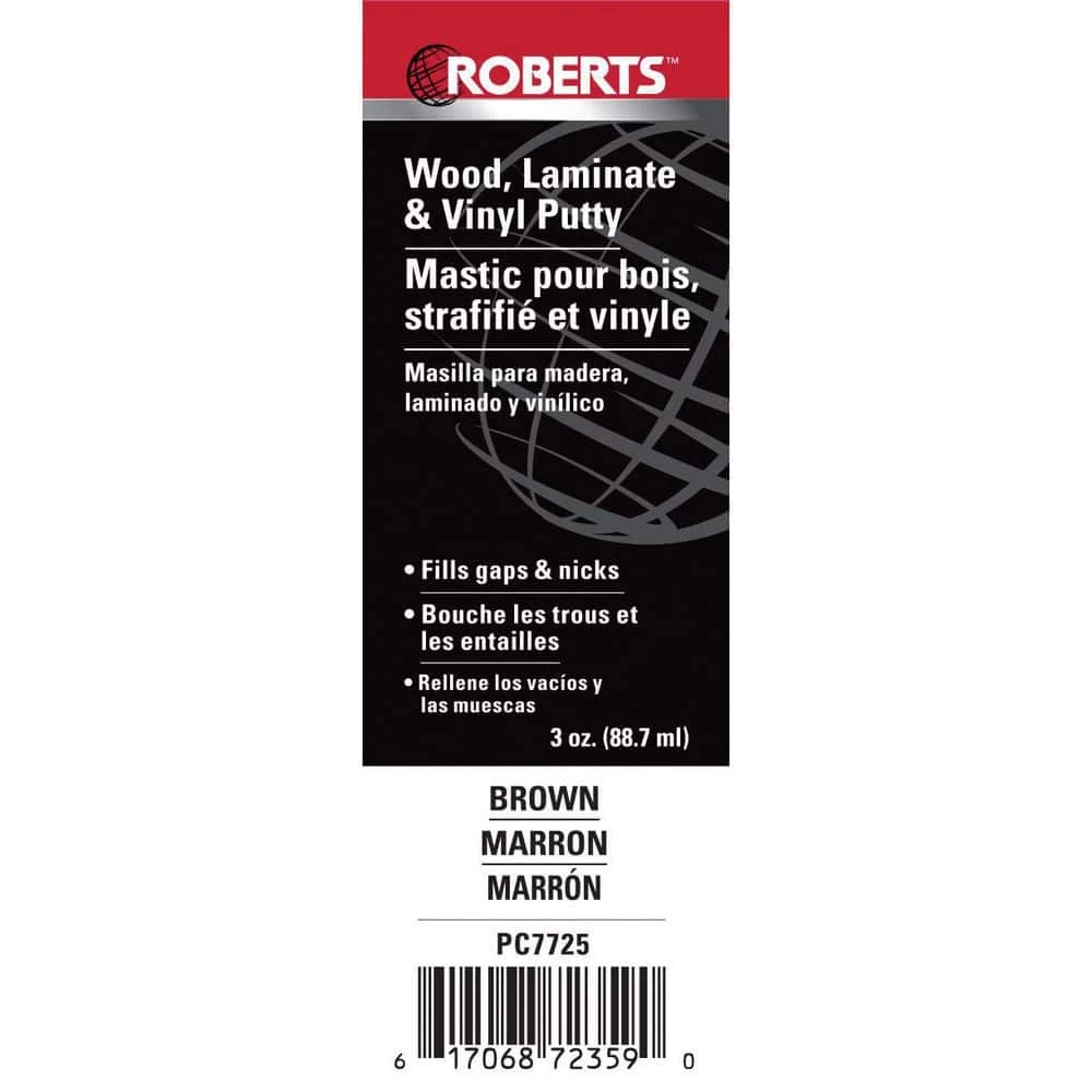ROBERTS Putty effectively fills gaps, nicks and scratches on Wood, Laminate and Vinyl flooring. Fast drying, it can be used during installation to fill nail and screw holes, or to repair damage on existing floors. The putty comes in a 3 oz. easy to squeeze tube for quick application. For best results, clean the surface before applying, making sure it is free of grease and dirt, knead the tube thoroughly for 20 seconds before use, and cut tip to desired bead size.