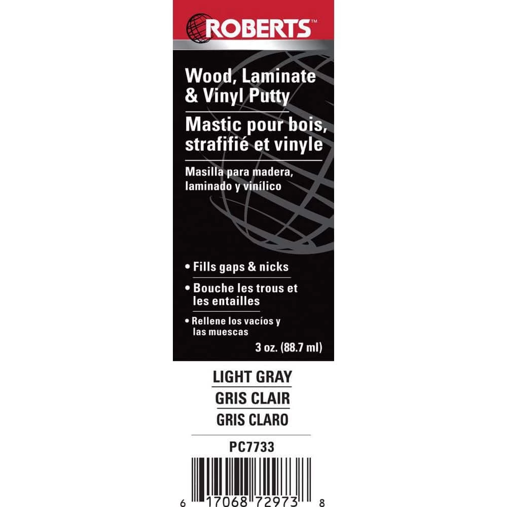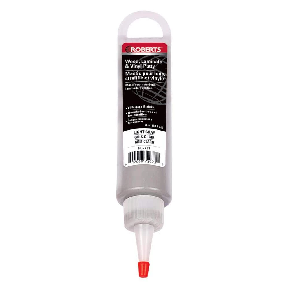 ROBERTS Putty effectively fills gaps, nicks and scratches on Wood, Laminate and Vinyl flooring. Fast drying, it can be used during installation to fill nail and screw holes, or to repair damage on existing floors. The putty comes in a 3 oz. easy to squeeze tube for quick application. For best results, clean the surface before applying, making sure it is free of grease and dirt, knead the tube thoroughly for 20 seconds before use, and cut tip to desired bead size.