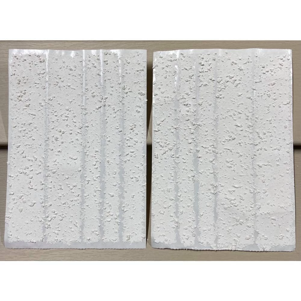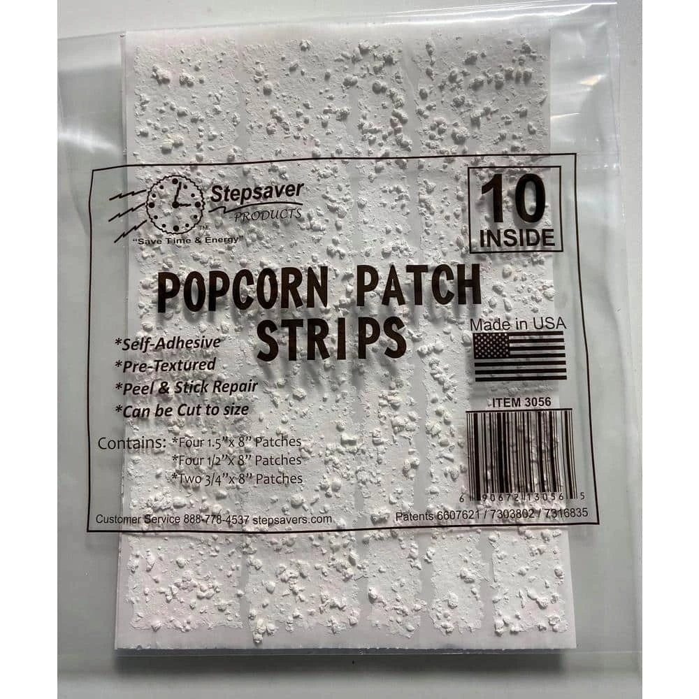 Stepsaver PRODUCTS Self-Adhesive Popcorn Ceiling Repair Patch Strips is a self-Adhesive, paint ready, popcorn ceiling repair patch kit. It is designed to repair stained or damaged popcorn ceilings. Popcorn Ceiling Patch can be cut and placed as needed. Comes with 8 in. strips on 2-sheets (see product images). Self-Adhesive Popcorn Ceiling Patch is very simple to use. Simply prep, press and paint. No more need to mask and cover everything in the room to avoid the mess generated by using expensive cans of spray texture. Be sure the area is clean, dry and dust free. The permanent adhesive is pressure sensitive so press firmly in order to activate properly.